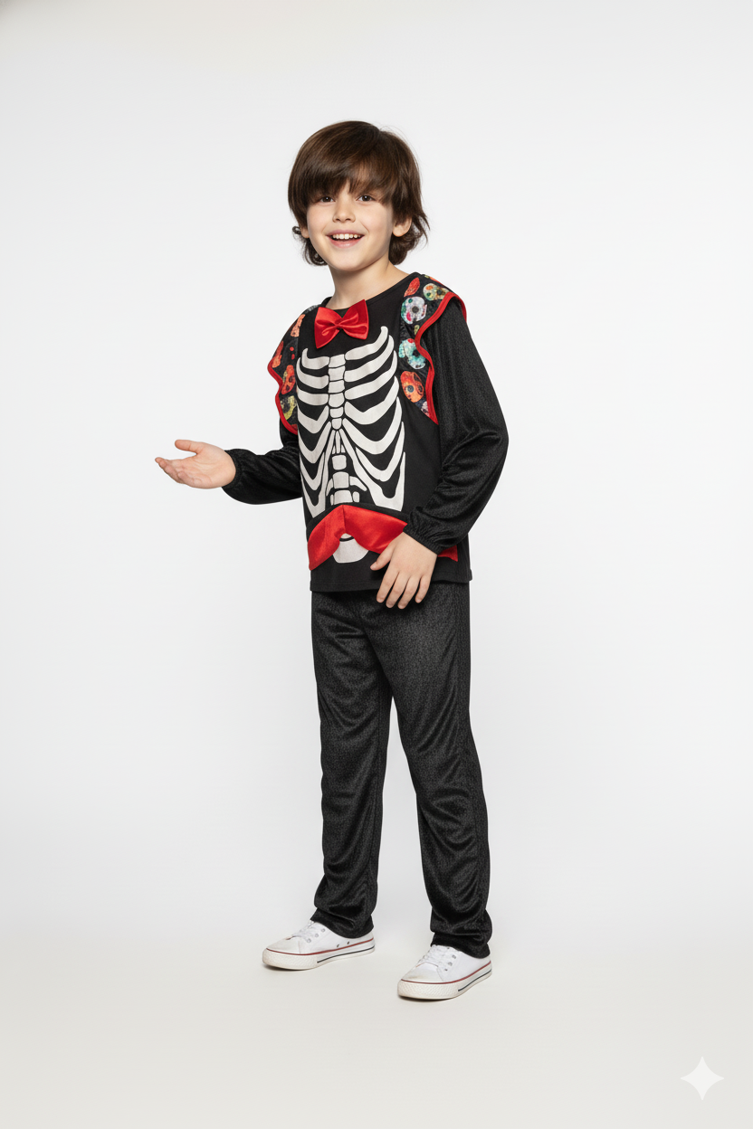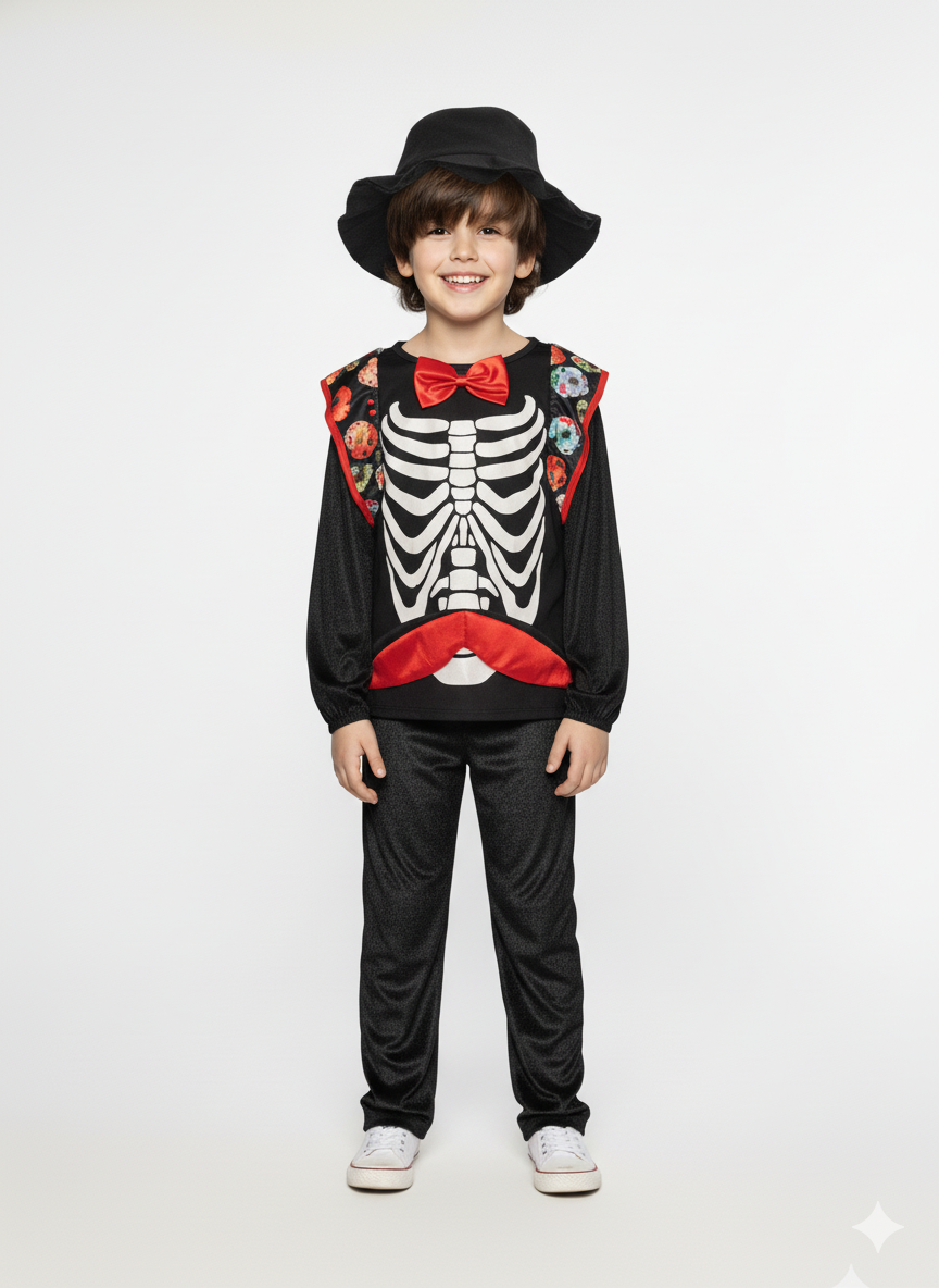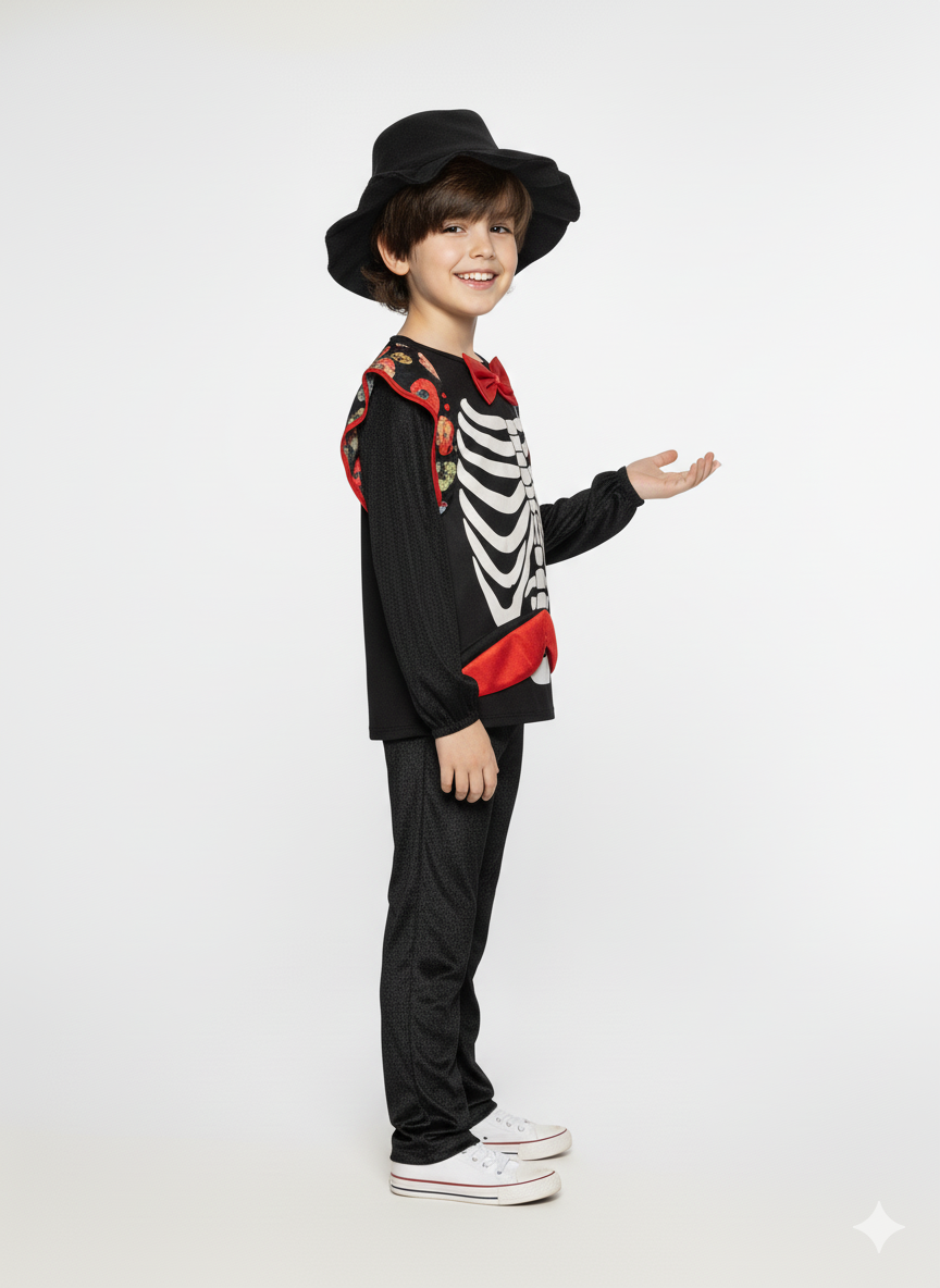 Convierte a tu pequeño en el alma de la fiesta con este disfraz de Catrín diseñado especialmente para niños. Incluye un sombrero cómodo que se ajusta perfectamente, garantizando diversión sin molestias. Ideal para celebrar con estilo y alegría, este conjunto mezcla tradición y confort para que los niños disfruten cada momento.