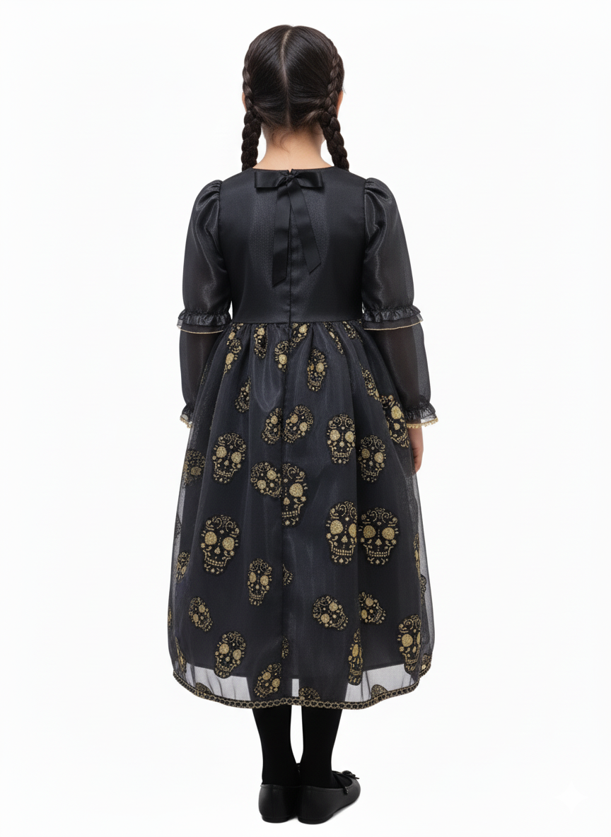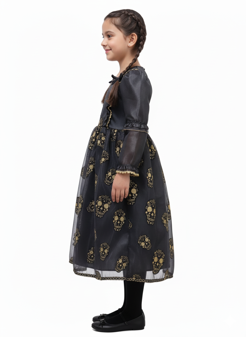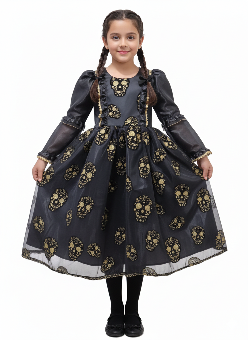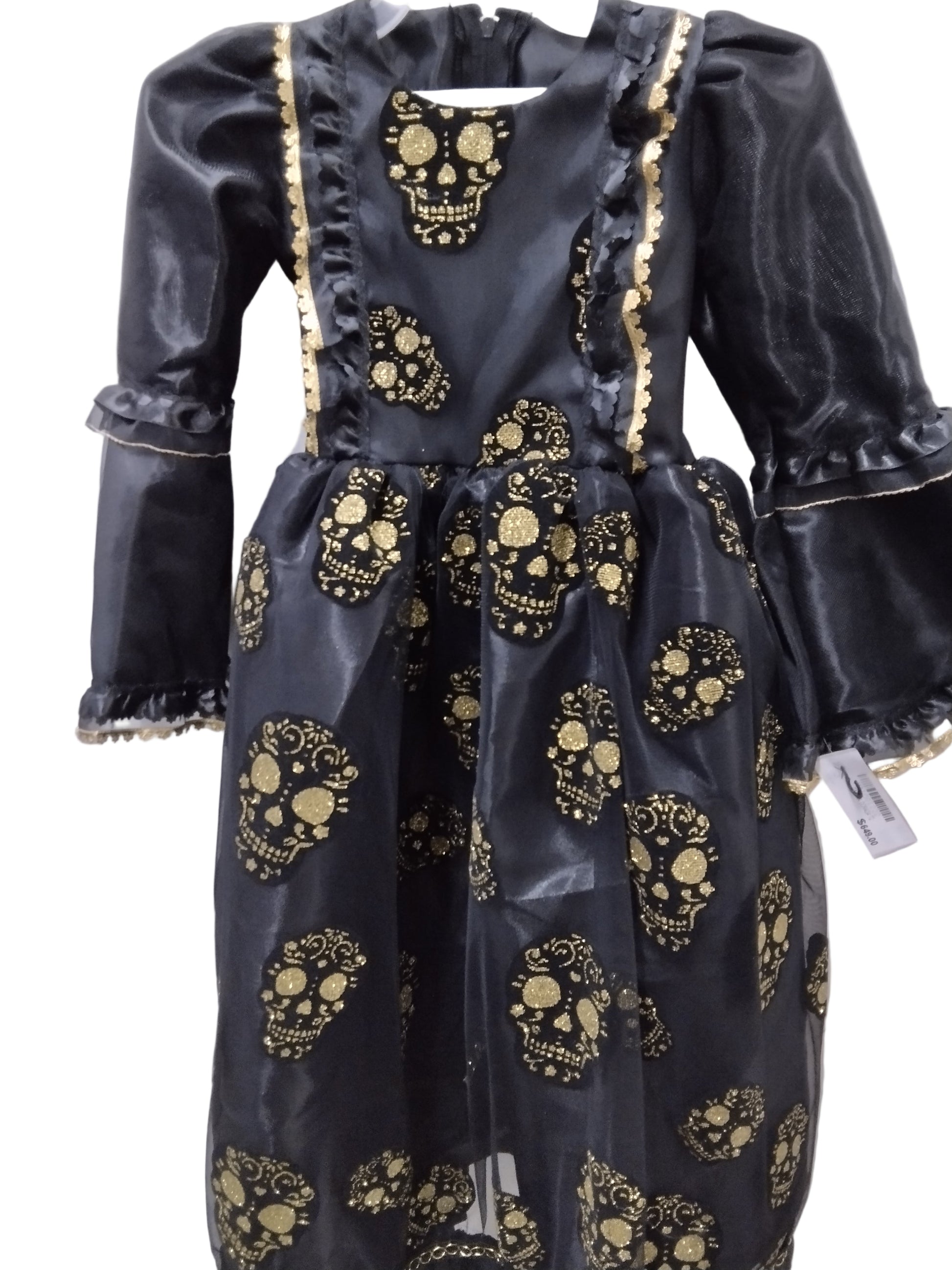 Haz que tu pequeña brille con el disfraz de Catrina Dorada, lleno de detalles brillantes y colores vibrantes. Perfecto para fiestas y celebraciones del Día de Muertos, este vestido transforma a cualquier niña en una pequeña obra de arte llena de vida y alegría. ¡Listas para bailar y disfrutar con estilo!