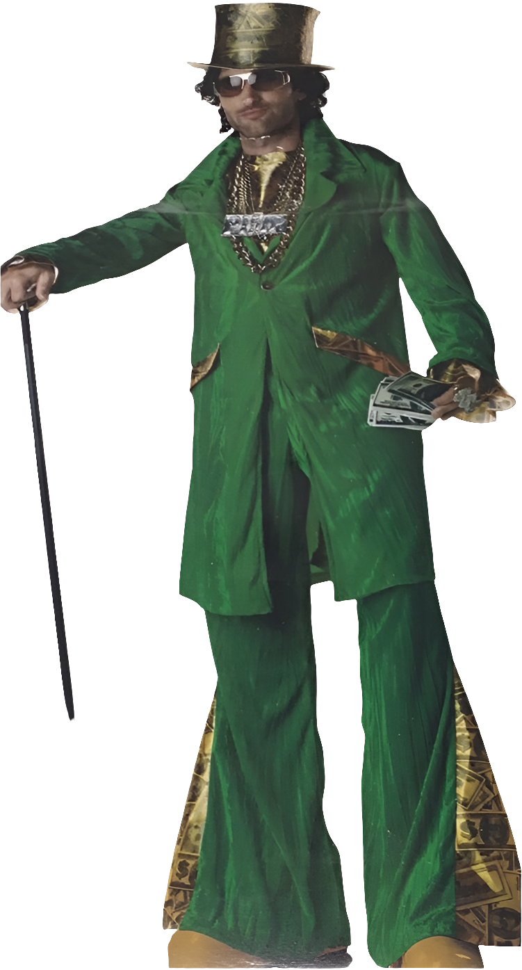 Este Disfraz adulto Hustla es la última tendencia en moda para asistir a cualquier fiesta. Prendas de vestir de color verde con acentos de oro en forma de billetes de dólar sobre el saco y los pantalones, además de un sombrero de copa con el mismo motivo de dolar, le dará el toque más elegante y sofisticado que define esta lujosa línea. Esta pieza única le hará destacar en cualquier ocasión.