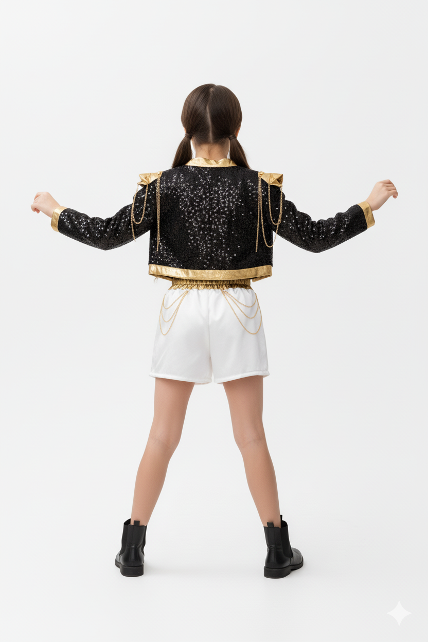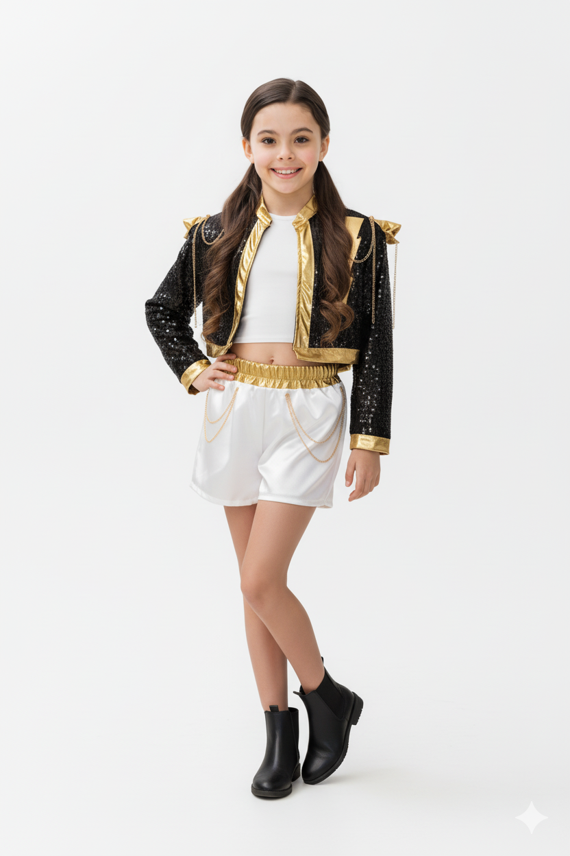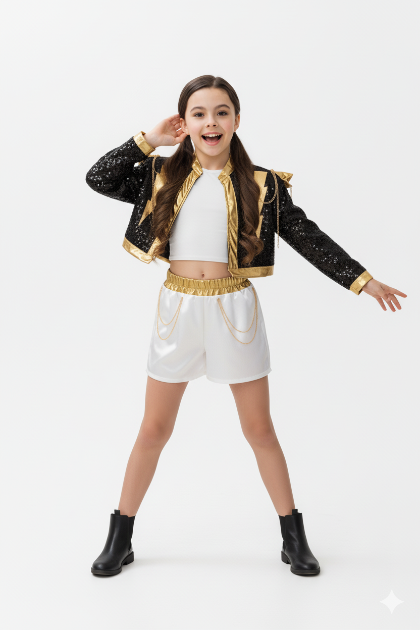 Este disfraz para niña inspirado en Las Guerreras K-pop combina estilo y energía en un diseño negro moderno y audaz. Perfecto para quienes sueñan con brillar como sus ídolos, ofrece comodidad y libertad para bailar y divertirse al máximo. ¡Haz que tu pequeña destaque con este outfit lleno de actitud y ritmo!