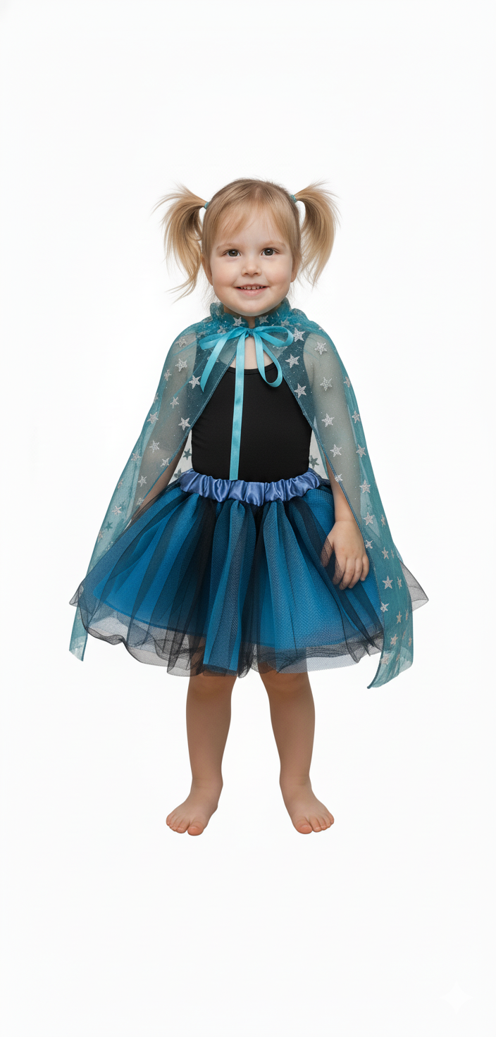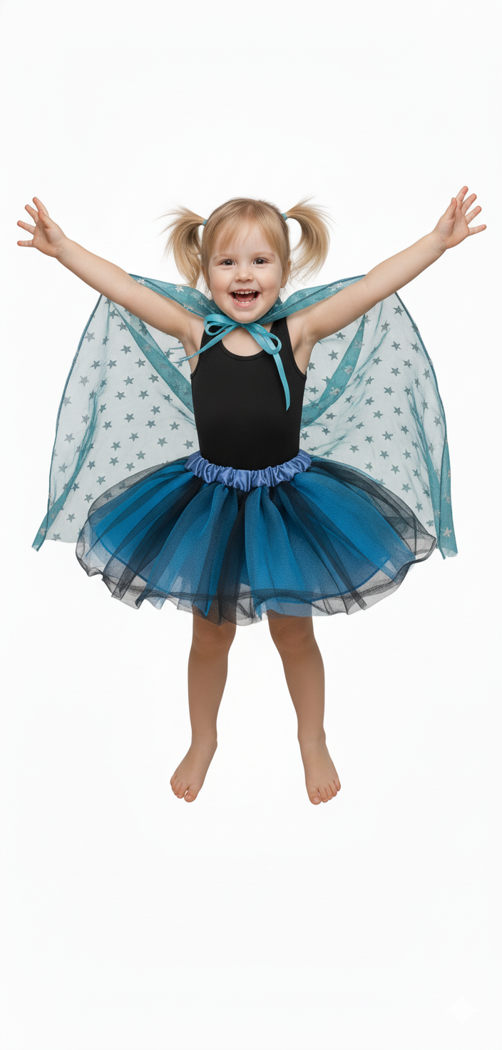 Este disfraz de tutu con capa es perfecto para las más pequeñas que disfrutan de la magia y el juego. Incluye un tutu delicado y una capa vibrante, además de un leotardo negro que aporta comodidad y estilo. Ideal para fiestas, juegos o cualquier ocasión en la que quieran sentirse especiales y llenas de alegría. ¡Listas para bailar y soñar!