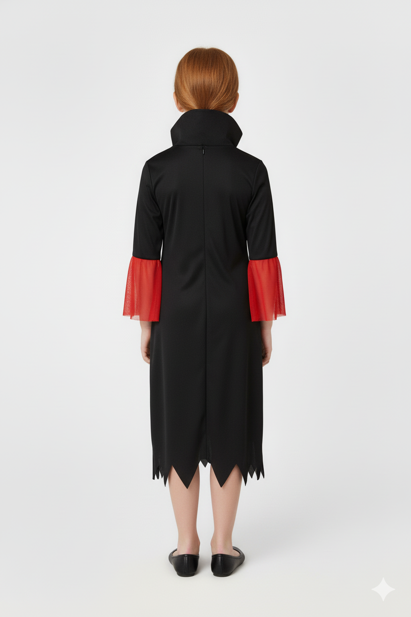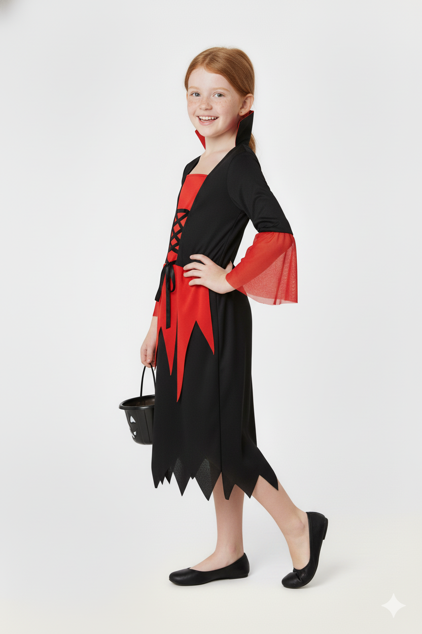 Haz que tu pequeña destaque con este disfraz de vampira en una vibrante combinación de negro y rojo. El cuello montable añade un toque dramático y divertido que hará que cualquier fiesta sea inolvidable. Diseño cómodo y original, perfecto para que disfrute sin límites. No incluye canasta. ¡Prepárate para noches llenas de magia y misterio!